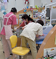 受診初日はお子さんに診療室の雰囲気に慣れてもらうということと、むし歯予防の重要性をご理解いただくために個別で歯みがき指導を行います。お口の中をむし歯ができにくい環境にすることが大切です。歯の生え方、年齢に適した新しい歯ブラシを差し上げますので実際にその場で磨いていただきます。使用した歯ブラシはお持ち帰りください。痛いなどの緊急を要する揚合はもちろん処置から行います。